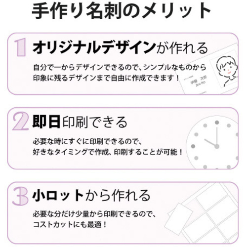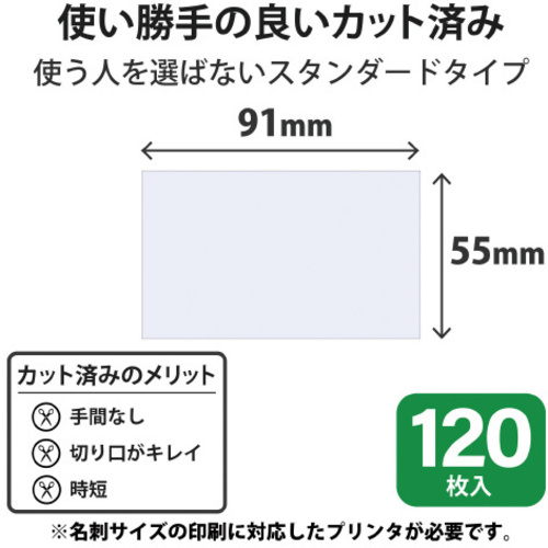 増量、低価格でみんな納得:なっとく名刺。名刺サイズでカットされているからエッジの仕上がりがきれい。●サイズ/名刺サイズ(55×91mm)●両面印刷/可能●対応プリンタ/インクジェットプリンタ●紙厚/200μm●単位/1冊(120枚入) 【返品に関するご注意】※開封後はお客様のご都合による返品はお受けできません。