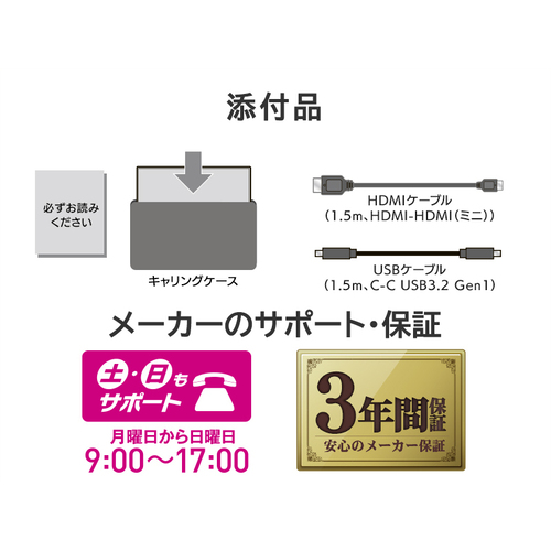 ●保証期間/3年●サイズ/17.3型●液晶パネル方式/AAS(IPS相当)●表示色/1677万色●ピッチ/0.1989(H)×0.1989(V)mm●走査周波数(水平)/31.4-67.5●走査周波数(垂直)/59.9-60.4●解像度/1920×1080ドット(HDTV)●輝度/220cd/m2●コントラスト比/1000:1(CREXレベル2設定時:24400:1)●視野角/上下:178°左右:178°●入力信号/HDMI(ミニ)、USBType-C(DisplayPortAltMode)●入力端子/HDMI(ミニ)、USBType-C(DisplayPortAltMode)●ケーブル/HDMIケーブル(1.5m、HDMI-HDMI(ミニ))、USBケーブル(1.5m、C-CUSB3.2Gen1)●スピーカー/なし●本体サイズ(H×W×D)/(本体のみ):約248(H)×399(W)×16(D)mm※突起部除く●本体重量/1000g●本体カラー/ブラック●電源/USBType-Cより電源供給●最大消費電力/7.5W【ご注意事項】※こちらの商品は返品不可商品となります。※商品仕様につきましては、メーカーHPにてご確認ください。※仕入先直送品のため、在庫状況により上記お届け目安にてお届けできない場合がございます。※詳細納期をご確認されたい場合は、0120-812-069までご連絡ください。(お問い合わせ受付時間)月曜日~金曜日9時から18時30分(祝日を除く)