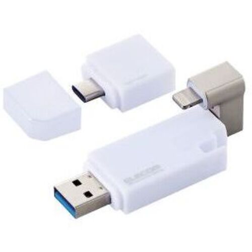 ●USB-AコネクタとLightningコネクタに加え、USB Type-C変換アダプタがついた、様々な端末でマルチに使えるUSBメモリです。 ●対応機種/Windows 11、10、8.1が動作するWindowsパソコン、macOS Monterey 12、macOS Big Sur 11が動作するMac、Android 12、11が動作するUSBホスト機能(OTG)付きのAndroidスマートフォン及びタブレット、iOS 15、14が動作するiOSデバイス、iPadOS 15、14が動作するiPadOSデバイス。 ●データコピーソフトウェア対応OS/iOS 15、14、Android 12、11 ●インターフェイス/USB3.2(Gen1) ●コネクタ形状/USBメモリ本体:USBーA オス、Lightningコネクタ オス、変換アダプタ:USB-A メス <ーー> USB TypeーC オス ●容量/256GB ●外形寸法/USBメモリ本体:W65×D21×H11.2mm、変換アダプタ:W29×D21×H11.2mm(コネクタ部含む) ●重量/USBメモリ本体/約15.5g、変換アダプタ:約4g ●カラー/ホワイト ●保証期間/1年間【ご注意事項】※こちらの商品は返品不可商品となります。※商品仕様につきましては、メーカーHPにてご確認ください。※仕入先直送品のため、在庫状況により上記お届け目安にてお届けできない場合がございます。※詳細納期をご確認されたい場合は、0120-812-069までご連絡ください。(お問い合わせ受付時間)月曜日~金曜日9時から18時30分(祝日を除く)