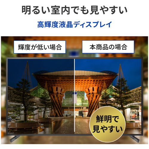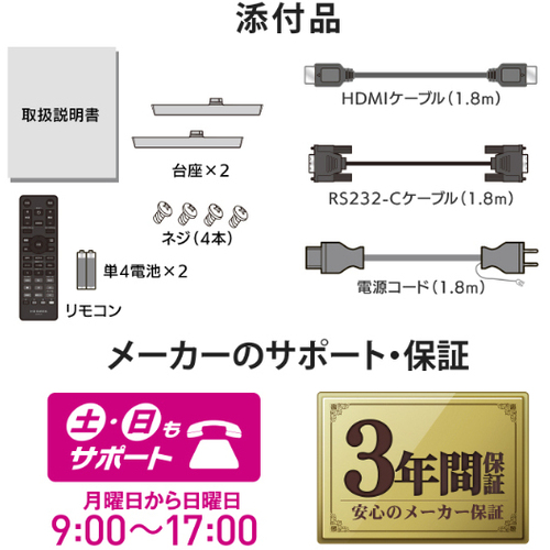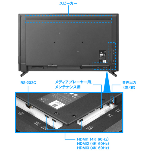 設置作業のサービスは実施しておりません。メーカーまたは専門業者にご相談ください。●4K UHD解像度に対応した、大画面50型(可視領域49.5型)のワイド液晶ディスプレイです。オフィスの会議室での利用はもちろんデジタルサイネージとしての利用もおすすめです。18時間連続稼働に対応しており、長時間稼働が必要となる環境でも安心です。●フルHDの4倍の表示エリアの4K UHD(3840×2160ピクセル)に対応!映像の細部までをよりリアルに鮮明に表示できます。4倍の情報を表示できるので、オフィスの会議室でより多くの情報を一度に表示し、効率的な会議を行うことができます。●高輝度500cd/m2を実現。明るい室内でも、文字や写真なども見やすいので、サイネージに最適です。●18時間連続稼働に対応しているので、長時間稼働が必要となる、商業施設や小売店舗、宿泊施設などでのデジタルサイネージで安心してご利用いただけます。●保証期間/3年●サイズ/49.5型●液晶パネル方式/VA●表示色/10億7374万色※10bit入力時●ピッチ/0.285375(H)×0.285375(V)mm●走査周波数(水平)/31.5-135.0●走査周波数(垂直)/29.9-60.3●解像度/3840×2160●輝度/500cd/m2●コントラスト比/4000:1●視野角/上下:178°左右:178°●入力信号/HDMI(HDCP2.2)、D-sub9ピン(オス)●入力端子/HDMI(HDCP2.2)、D-sub9ピン(オス)●ケーブル/HDMIケーブル(1.8m)、電源コード(1.8m、PSE適合品)、RS232-Cケーブル(1.8m)●スピーカー/あり5W+5W(ステレオ)●本体サイズ(H×W×D)/(本体のみ):約680(H)×1120(W)×260(D)mm※突起部除く●本体重量/13100g●本体カラー/ブラック●電源/電源内蔵●最大消費電力/142W【ご注意事項】※こちらの商品は返品不可商品となります。※商品仕様につきましては、メーカーHPにてご確認ください。※仕入先直送品のため、在庫状況により上記お届け目安にてお届けできない場合がございます。※詳細納期をご確認されたい場合は、0120-812-069までご連絡ください。(お問い合わせ受付時間)月曜日~金曜日9時から18時30分(祝日を除く)
