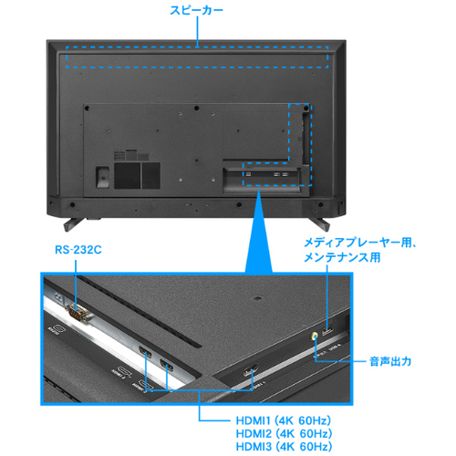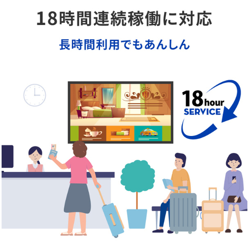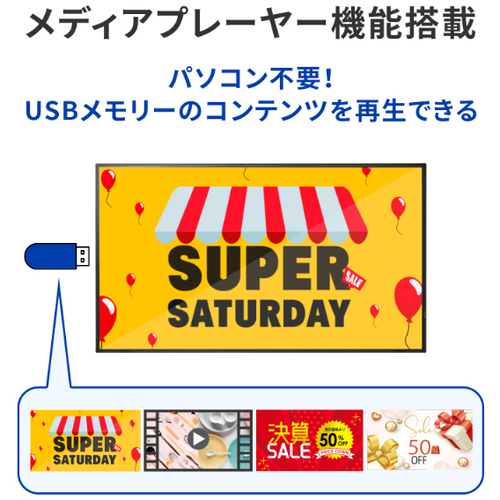 設置作業のサービスは実施しておりません。メーカーまたは専門業者にご相談ください。●4K UHD(3840×2160ピクセル)解像度に対応した大画面43型(可視領域42.5型)のワイド液晶ディスプレイです。3辺フレームレスですっきりとした見た目です。18時間連続稼働に対応で長時間稼働でも安心です。メディアプレイヤー機能を搭載しております。●フルHDの4倍の表示エリアの4K UHD(3840×2160ピクセル)に対応!映像の細部までをよりリアルに鮮明に表示できます。4倍の情報を表示できるので、オフィスの会議室でより多くの情報を一度に表示し、効率的な会議を行うことができます。●18時間連続稼働に対応しているので、長時間稼働が必要となる、商業施設や小売店舗、宿泊施設などでのデジタルサイネージで安心してご利用いただけます。●保証期間/3年●サイズ/43型●液晶パネル方式/ADS(IPS相当) ●表示色/10億7374万色※10bit入力時●ピッチ/0.2451(H)×0.2451(V)mm●走査周波数(水平)/31.5-135.0●走査周波数(垂直)/29.9-60.3●解像度/3840×2160●輝度/350cd/m2●コントラスト比/1200:1●視野角/上下:178°左右:178°●入力信号/HDMI(HDCP2.2)、D-sub9ピン(オス)●入力端子/HDMI(HDCP2.2)、D-sub9ピン(オス)●ケーブル/HDMIケーブル(1.8m)、電源コード(1.8m、PSE適合品)●スピーカー/あり5W+5W(ステレオ)●本体サイズ(H×W×D)/(本体のみ):約590(H)×960(W)×260(D)mm※突起部除く●本体重量/7300g●本体カラー/ブラック●電源/電源内蔵●最大消費電力/101W【ご注意事項】※こちらの商品は返品不可商品となります。※商品仕様につきましては、メーカーHPにてご確認ください。※仕入先直送品のため、在庫状況により上記お届け目安にてお届けできない場合がございます。※詳細納期をご確認されたい場合は、0120-812-069までご連絡ください。(お問い合わせ受付時間)月曜日~金曜日9時から18時30分(祝日を除く)