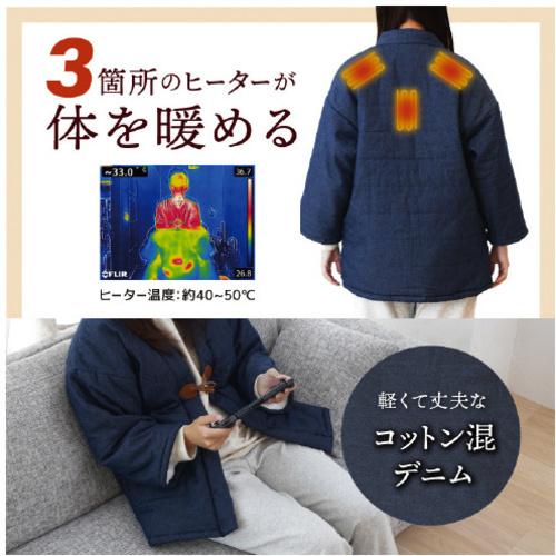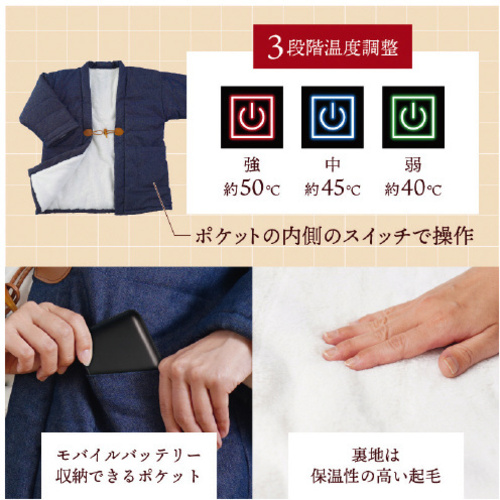 半纏に電熱ヒーターが3箇所入った、電熱半纏「ほかてんライト」です。洗濯機で丸洗い可能。●重量/約0.8kg●電源/USB(5V 2.0A 以上)●消費電力/約7W●稼働時間/強:5 時間 中:6.5 時間 弱:8 時間(10000mAh モバイルバッテリー使用時※使用環境15℃で測定※モバイルバッテリーの性能、環境温度により異なる)●温度/低:約40度 中:約45度 高:約50度(使用環境、モバイルバッテリーの性能により異なる)●前ポケットバッテリーサイズ/縦幅19×横幅18(cm)●ケーブル長さ/約170mm●材質/表地:綿65% ポリエステル33% スパンデックス2%、裏地:ポリエステル100% 中綿:ポリエステル100%●セット内容/本体、取扱説明書●保証期間/購入より12ヶ月●単位/●単位/1着 【返品に関するご注意】※この商品はお取り寄せ品のため、お客様のご都合による返品はお受けできません。
