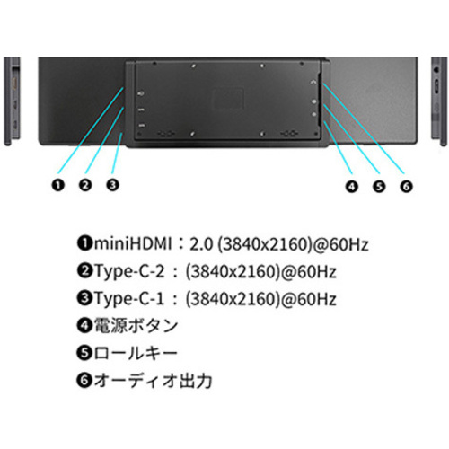 ●保証期間/2年●サイズ/18.5型●液晶パネル方式/IPS●表示色/10.7億色sRGB99%、DCI-P389%●ピッチ/約0.1065mm●解像度/3840×2160●輝度/280cd/m2●コントラスト比/1000:1●視野角/H:175oV:175o●入力信号/デジタル●入力端子/HDMI×1、TYPE-C×2●ケーブル/miniHDMI-HDMIケーブル、Type-Cケーブル●スピーカー/あり「1W×2」●本体サイズ(H×W×D)/高256mmx幅432mmx奥行18.3mm●本体重量/約1.86kg●本体カラー/ブラック●電源/AC100-240V50、60HzToDC5V、3A●最大消費電力/18W【ご注意事項】※こちらの商品は返品不可商品となります。※商品仕様につきましては、メーカーHPにてご確認ください。※仕入先直送品のため、在庫状況により上記お届け目安にてお届けできない場合がございます。※詳細納期をご確認されたい場合は、0120-812-069までご連絡ください。(お問い合わせ受付時間)月曜日~金曜日9時から18時30分(祝日を除く)