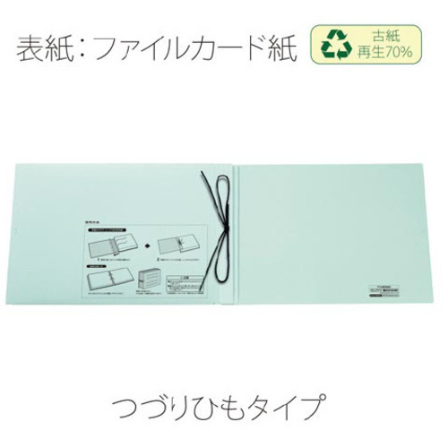 つづりひもタイプ。背幅がのびて、最大800枚まで収容可能●サイズ/A5ヨコ●寸法/縦155mm×横220mm×背幅18から98mm●カラー/ブルー●材質/表紙:ファイルカード紙●穴数/2穴●付属品/つづりひも(70cm)●表紙厚/約0.47mm●最大収容枚数/約800枚●単位/1冊