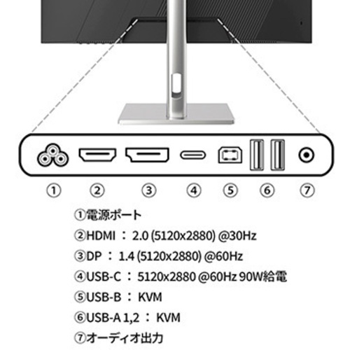 ●保証期間/2年●サイズ/27型●液晶パネル方式/IPS●表示色/10.7億色sRGB137%/DCI-P3100%●ピッチ/約0.116mm●解像度/5120×2880●輝度/350cd/m2●コントラスト比/2000:1●視野角/H:178oV:178o●入力信号/デジタル●入力端子/DP×1/HDMI/Type-C●ケーブル/HDMIケーブル、Type-Cケーブル、USBA-Bケーブル、電源ケーブル●スピーカー/あり「3W×2」●本体サイズ(H×W×D)/408-518/626-648mm×614/363mm×191mm●本体重量/5.7kg●本体カラー/ブラック●電源/AC100-240V50/60Hz●最大消費電力/140W【ご注意事項】※こちらの商品は返品不可商品となります。※商品仕様につきましては、メーカーHPにてご確認ください。※仕入先直送品のため、在庫状況により上記お届け目安にてお届けできない場合がございます。※詳細納期をご確認されたい場合は、0120-812-069までご連絡ください。(お問い合わせ受付時間)月曜日~金曜日9時から18時30分(祝日を除く)