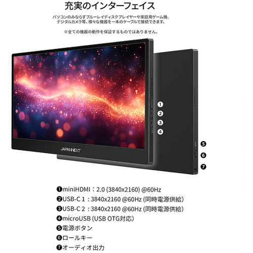 ●保証期間/2年●サイズ/13.3型●液晶パネル方式/OLED●表示色/10.7億色sRGB100%/DCI-P3100%●ピッチ/約0.077mm●解像度/3840×2160●輝度/300cd/m2●コントラスト比/100000:1●視野角/H:178oV:178o●入力信号/デジタル●入力端子/miniHDMI×1/Type-c×2●ケーブル/miniHDMI-HDMIケーブル、Type-Cケーブル、Type-C-USB-Aケーブル、電源ケーブル●スピーカー/あり「1W×2」●本体サイズ(H×W×D)/195mm×305mm×10mm●本体重量/0.65kg●本体カラー/ブラック●電源/AC100V50/60HzToDC5V/3A●最大消費電力/15W【ご注意事項】※こちらの商品は返品不可商品となります。※商品仕様につきましては、メーカーHPにてご確認ください。※仕入先直送品のため、在庫状況により上記お届け目安にてお届けできない場合がございます。※詳細納期をご確認されたい場合は、0120-812-069までご連絡ください。(お問い合わせ受付時間)月曜日~金曜日9時から18時30分(祝日を除く)