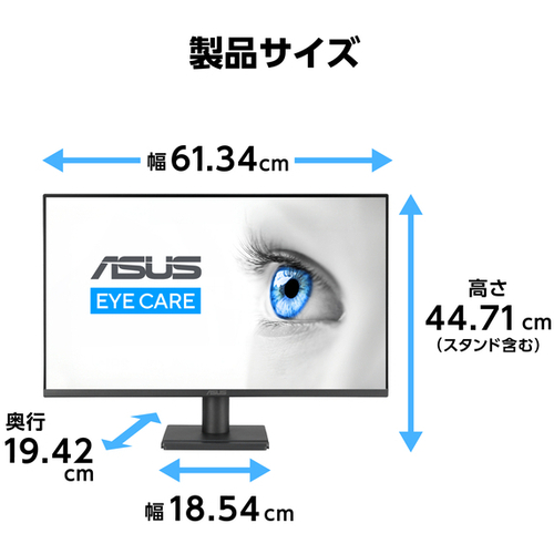 ●サイズ/27型●液晶パネル方式/IPS●表示色/1677万色●ピッチ/0.311mm●応答速度/1ms●解像度/1920×1080●輝度/300cd/m2●コントラスト比/1.500:1(typ)●視野角/水平178°/垂直178°●入力端子/DisplayPort1.2×1、HDMI(v1.4)×1、VGA×1、3.5mmステレオミニジャック●ケーブル/Displayportケーブル、HDMIケーブル●スピーカー/あり2W×2●本体サイズ(H×W×D)/447×613×194●本体重量/3.77kg●本体カラー/ブラック●電源/内蔵●最大消費電力/15W【ご注意事項】※こちらの商品は返品不可商品となります。※商品仕様につきましては、メーカーHPにてご確認ください。※仕入先直送品のため、在庫状況により上記お届け目安にてお届けできない場合がございます。※詳細納期をご確認されたい場合は、0120-812-069までご連絡ください。(お問い合わせ受付時間)月曜日~金曜日9時から18時30分(祝日を除く)
