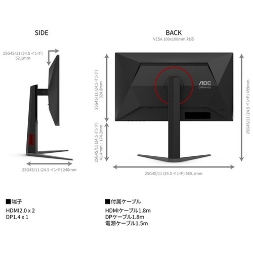 ●サイズ/24.5型●液晶パネル方式/FastIPS●表示色/約1677万色●解像度/1920×1080ドット●輝度/400cd/m2●コントラスト比/80000000:1●視野角/左右178°、上下178°●入力端子/HDMI2.0x2、DisplauPort1.4x1●ケーブル/電源ケーブル1.5m、HDMIケーブル1.8m、Displayportケーブル1.8m●スピーカー/なし●本体サイズ(H×W×D)/499.0x560.1x240.0mm●本体重量/4.22kg●本体カラー/ブラック●電源/AC100~240V【ご注意事項】※こちらの商品は返品不可商品となります。※商品仕様につきましては、メーカーHPにてご確認ください。※仕入先直送品のため、在庫状況により上記お届け目安にてお届けできない場合がございます。※詳細納期をご確認されたい場合は、0120-812-069までご連絡ください。(お問い合わせ受付時間)月曜日~金曜日9時から18時30分(祝日を除く)