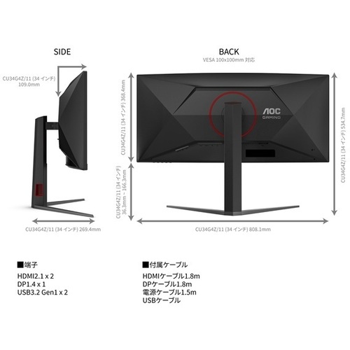 ●サイズ/34型●液晶パネル方式/FastVA●表示色/約10億7300万色●解像度/3440×1440ドット●輝度/400cd/m2●コントラスト比/80000000:1●視野角/左右178°、上下178°●入力端子/HDMI2.1x2、DisplauPort1.4x1(HDR)●ケーブル/電源ケーブル1.5m、HDMIケーブル1.8m、Displayportケーブル1.8m●スピーカー/なし●本体サイズ(H×W×D)/534.7x808.1x269.4mm●本体重量/8.62kg●本体カラー/ブラック●電源/AC100~240V【ご注意事項】※こちらの商品は返品不可商品となります。※商品仕様につきましては、メーカーHPにてご確認ください。※仕入先直送品のため、在庫状況により上記お届け目安にてお届けできない場合がございます。※詳細納期をご確認されたい場合は、0120-812-069までご連絡ください。(お問い合わせ受付時間)月曜日~金曜日9時から18時30分(祝日を除く)