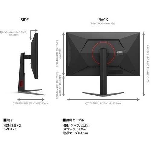 ●サイズ/27型●液晶パネル方式/FastVAwithMiniLED1152zones●表示色/約1677万色●解像度/2560×1440ドット●輝度/450cd/m2●コントラスト比/80000000:1●視野角/左右178°、上下178°●入力端子/HDMI2.0x2、DisplauPort1.4x1●ケーブル/電源ケーブル1.5m、HDMIケーブル1.8m、Displayportケーブル1.8m●スピーカー/なし●本体サイズ(H×W×D)/516.5x614x240mm●本体重量/7.05kg●本体カラー/ブラック●電源/AC100~240V【ご注意事項】※こちらの商品は返品不可商品となります。※商品仕様につきましては、メーカーHPにてご確認ください。※仕入先直送品のため、在庫状況により上記お届け目安にてお届けできない場合がございます。※詳細納期をご確認されたい場合は、0120-812-069までご連絡ください。(お問い合わせ受付時間)月曜日~金曜日9時から18時30分(祝日を除く)