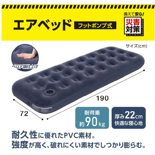 防災用品やレジャー用品として使用できる簡易エアーベッドです。フットポンプ内臓なので、外付けポンプを準備する必要がありません。足で繰り返し踏むだけで、最短2分程で簡単に膨らませることができます。●セット内容/ベッド本体、修理シール●材質/ベッド:PVC、フットポンプ:ABS樹脂、PVC、シリコーン、ステンレス、修理シール:PVC●質量/約730g●寸法/約幅720×奥行1900×高さ220mm●全体耐荷重/約90kg●単位/1個 【ご注意事項】※乳幼児またはお体の不自由な方は私用しないでください。