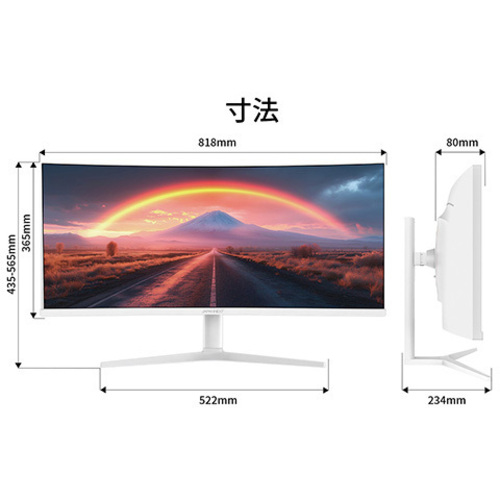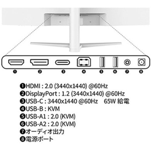 ●保証期間/2年●サイズ/34型●液晶パネル方式/IPS●表示色/10.7億色sRGB99%/DCI-P385%●ピッチ/約0.232mm●解像度/3440×1440●輝度/300cd/m2●コントラスト比/1000:1●視野角/H:178oV:178o●入力信号/デジタル●入力端子/HDMI×1/DP×1/Type-C×1●ケーブル/Type-C、USB-B、HDMI●スピーカー/あり「3W×2」●本体サイズ(H×W×D)/高435-565mm×幅818mm×奥行234mm●本体重量/約6.9kg●本体カラー/ホワイト●電源/AC100-240V50/60HzToDC24V/4A●最大消費電力/45W【ご注意事項】※こちらの商品は返品不可商品となります。※商品仕様につきましては、メーカーHPにてご確認ください。※仕入先直送品のため、在庫状況により上記お届け目安にてお届けできない場合がございます。※詳細納期をご確認されたい場合は、0120-812-069までご連絡ください。(お問い合わせ受付時間)月曜日~金曜日9時から18時30分(祝日を除く)