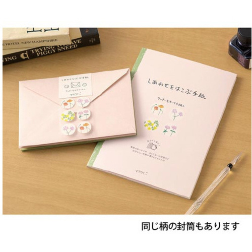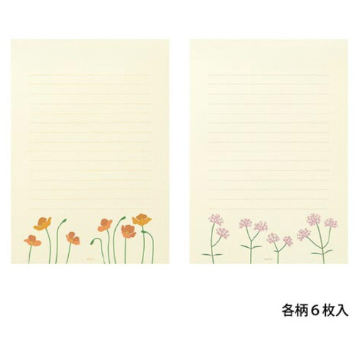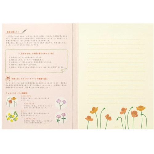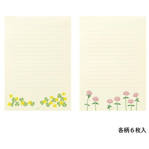 ラッキーモチーフを取り入れた、本のように開いて書けるオリジナル仕様の便箋です。ラッキーモチーフ:ナガミヒナゲシ、ヤナギハナガサ、カタバミ、ムラサキツメクサ●寸法/本体/タテ210×ヨコ148×奥行5mm●仕様/24枚入(4柄×6枚)●罫/横罫●単位/1冊