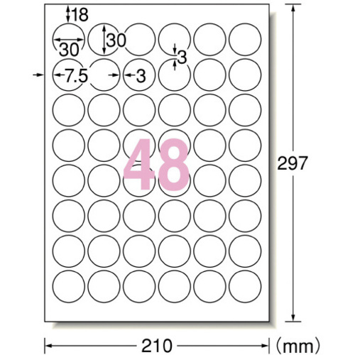インクジェットプリンタ(IJP)で印刷できる、なんと水に強い紙素材(光沢紙)のラベルシールです。紙素材なのに水に濡れてもインクがにじみにくい特殊加工を施しています。パッケージ、ラッピングシール作成に。●種別/超耐水マット紙●サイズ/A4●対応プリンタ/インクジェット(染料・顔料)●カラー/白無地●紙厚/0.22mm(ラベル本体):0.11mm●材質/上質紙+インクジェット専用塗工●坪量/185g/平方m●ラベル総厚/0.11mm●面付け/48面 丸型●1片寸法/30mm丸●単位/1冊(20枚入) 【ご注意事項】※ご使用の機種に対応する坪量をご確認のうえ、ご利用ください。※インターネットでエーワンのホームページにアクセスしていただければ印刷ソフト〈ラベル屋さん〉を無償でご利用いただけます。http://www.labelyasan.com/
