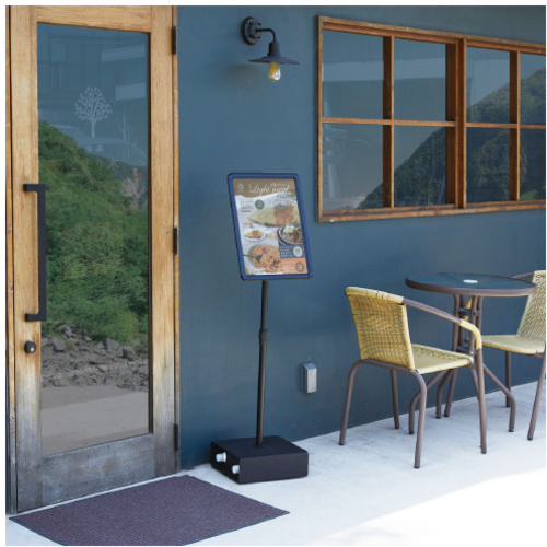 風に強いポスタースタンド。2Lのペットボトルを2本収納することで転倒防止になります。ポール部分の高さ調節、表示面の角度調節が可能です。●サイズ/A4●寸法/幅320×奥行260×高さ最大1255mm●有効画面寸法/掲示面寸法/縦190×横280mm●フレーム寸法/縦240×横330mm●フレーム幅/25mm●質量/3.0kg●材質/アルミニウム、ABS、PET、ステンレス、スチール●種別/本体●機能/転倒防止機能、高さ調節●カラー/ブラック●付属品/ミニドライバー、六角レンチ●生産国/中国●単位/1台 【ご注意事項】※雨のかかる場所でのご使用はお控えください。