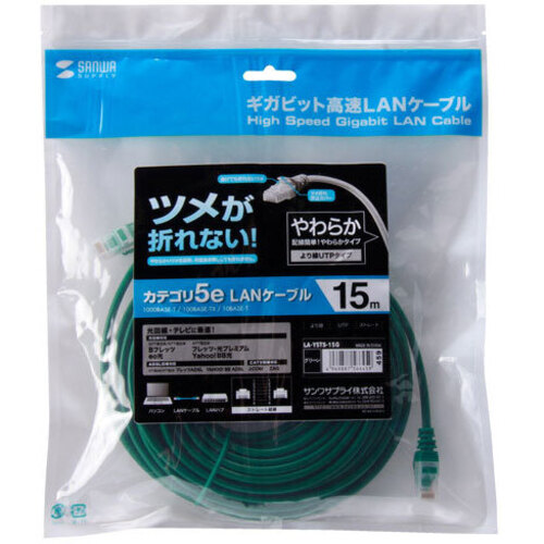 ●長さ/15m●結線/AWG26より線ツイストペアケーブル、ストレート全結線●色/グリーン●端子/RJ-45モールディングコネクタ付(ラッチカバー付き)●規格/エンハンスドカテゴリ5(1000BASE-T)、カテゴリ5(100BASE-TX)、カテゴリ3(10BASE-T)適合【ご注意事項】※こちらの商品は返品不可商品となります。※商品仕様につきましては、メーカーHPにてご確認ください。※仕入先直送品のため、在庫状況により上記お届け目安にてお届けできない場合がございます。※詳細納期をご確認されたい場合は、0120-812-069までご連絡ください。(お問い合わせ受付時間)月曜日~金曜日9時から18時30分(祝日を除く)
