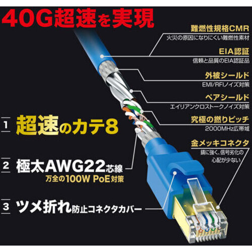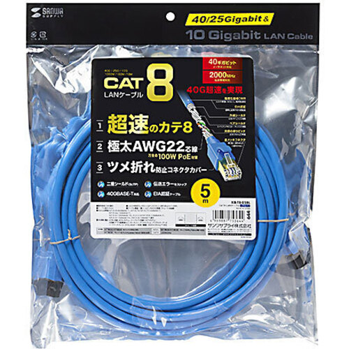 ●長さ/5m●結線/ストレート全結線●色/ブルー●端子/RJ-45シールドコネクタ(ツメ折れ防止カバー付き)●規格/カテゴリ8(40GBASE-T)、カテゴリ7A・カテゴリ7(10GBASE-T)、カテゴリ6a(10GBASE-T)、カテゴリ6(1000BASE-TX)、エンハンスドカテゴリ5(1000BASE-T)、カテゴリ5(100BASE-TX)、カテゴリ3(10BASE-T)適合【ご注意事項】※こちらの商品は返品不可商品となります。※商品仕様につきましては、メーカーHPにてご確認ください。※仕入先直送品のため、在庫状況により上記お届け目安にてお届けできない場合がございます。※詳細納期をご確認されたい場合は、0120-812-069までご連絡ください。(お問い合わせ受付時間)月曜日~金曜日9時から18時30分(祝日を除く)