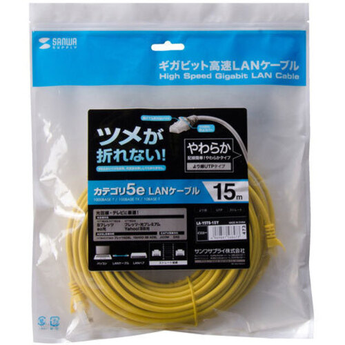 ●長さ/15m●結線/AWG26より線ツイストペアケーブル、ストレート全結線●色/イエロー●端子/RJ-45モールディングコネクタ付(ラッチカバー付き)●規格/エンハンスドカテゴリ5(1000BASE-T)、カテゴリ5(100BASE-TX)、カテゴリ3(10BASE-T)適合【ご注意事項】※こちらの商品は返品不可商品となります。※商品仕様につきましては、メーカーHPにてご確認ください。※仕入先直送品のため、在庫状況により上記お届け目安にてお届けできない場合がございます。※詳細納期をご確認されたい場合は、0120-812-069までご連絡ください。(お問い合わせ受付時間)月曜日~金曜日9時から18時30分(祝日を除く)