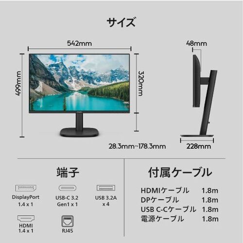 ●保証期間/5年●サイズ/23.8型●液晶パネル方式/IPS●表示色/約1677万色●ピッチ/0.2745x0.2745mm●解像度/1920×1080ドット●輝度/300cd/m2●コントラスト比/50000000:1●視野角/左右178°、上下178°●入力端子/USBType-C3.2(PD90W)x1、HDMI1.4x1、DisplayPort1.4x1●ケーブル/HDMIcable1.8M、DPcable1.8M、Powercable1.8M、USBtypeC-Ccable1.8M●スピーカー/あり2Wx2●本体サイズ(H×W×D)/499x542x228●本体重量/5.72kg●本体カラー/ブラック●電源/AC100-240V、50/60Hz●最大消費電力/148.3W【ご注意事項】※こちらの商品は返品不可商品となります。※商品仕様につきましては、メーカーHPにてご確認ください。※仕入先直送品のため、在庫状況により上記お届け目安にてお届けできない場合がございます。※詳細納期をご確認されたい場合は、0120-812-069までご連絡ください。(お問い合わせ受付時間)月曜日~金曜日9時から18時30分(祝日を除く)