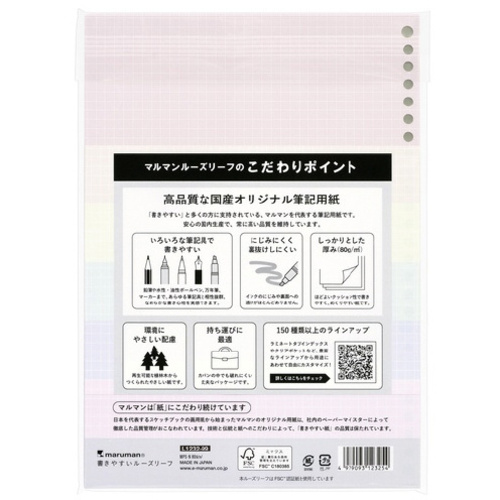 「書きやすさ」にこだわった、マルマンのルーズリーフ。くすみ色のペン色が映える、くすみカラーのルーズリーフ。●サイズ/B5●種別/ルーズリーフ●穴数/26穴●本体寸法/縦257×横182×厚7mm●重量/230g●内容/5mm方眼罫●本文/60枚●単位/1冊