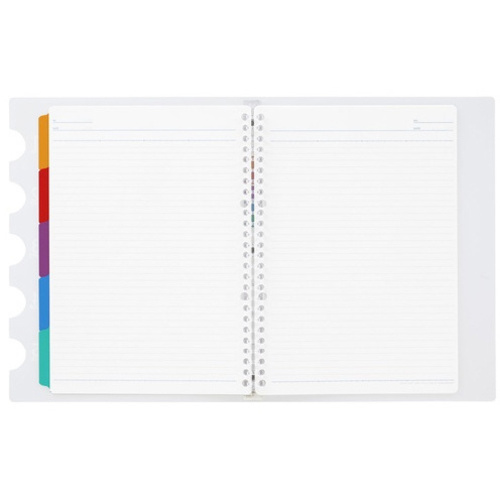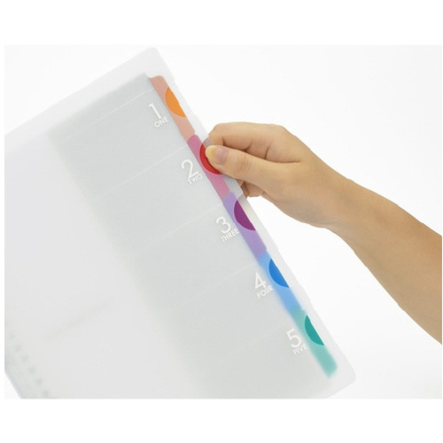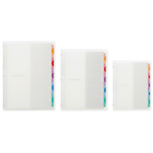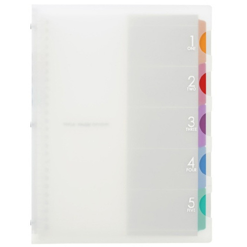 ロングセラーバインダー「5チャート」のクリアカラー。表紙の5つの切れ込みからインデックスが覗いているオシャレなバインダーです。5山のインデックスですっきり収納、ぱぱっと整理。一目で検索、すぐ開けます。●サイズ/B5●種別/プラスチックバインダー●穴数/26穴●本体寸法/縦275×横208×厚20mm●重量/240g●表紙素材/PP●内容/6mm横罫ルーズリーフ・ラミネートタブインデックス5山●本文/20枚●標準収納枚数/70枚●単位/1冊