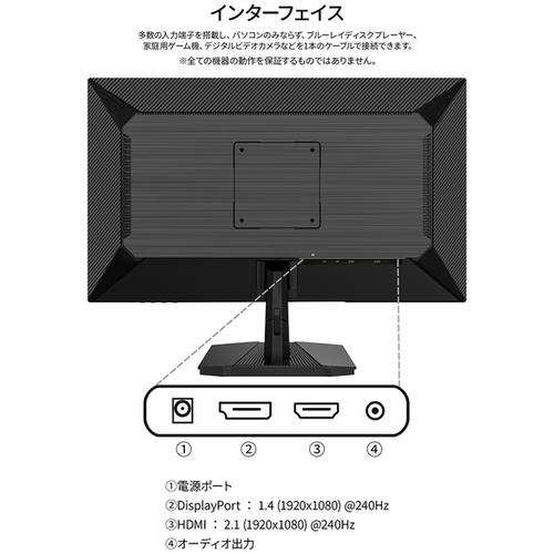 ●保証期間/2年●サイズ/24.5型●液晶パネル方式/IPS●表示色/1677万色sRGB100%DCI-P382%AdobeRGB77%●ピッチ/約0.282mm●解像度/1920×1080●輝度/350cd/m2●コントラスト比/1000:1●視野角/H:178°V:178°●入力信号/デジタル●入力端子/HDMI×1、DP×1●ケーブル/HDMIケーブル(1.5m)●スピーカー/なし●本体サイズ(H×W×D)/高419mm×幅558mm×奥行210mm スタンド幅216mm●本体重量/3kg●本体カラー/ブラック●電源/AC100-240V50/60HzToDC12V/3A●最大消費電力/34W【ご注意事項】※こちらの商品は返品不可商品となります。※商品仕様につきましては、メーカーHPにてご確認ください。※仕入先直送品のため、在庫状況により上記お届け目安にてお届けできない場合がございます。※詳細納期をご確認されたい場合は、0120-812-069までご連絡ください。(お問い合わせ受付時間)月曜日~金曜日9時から18時30分(祝日を除く)