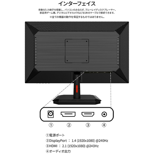 ●保証期間/2年●サイズ/24.5型●液晶パネル方式/IPS●表示色/1677万色sRGB100%DCI-P382%AdobeRGB77%●ピッチ/約0.282mm●解像度/1920×1080●輝度/350cd/m2●コントラスト比/1000:1●視野角/H:178°V:178°●入力信号/デジタル●入力端子/HDMI×1、DP×1●ケーブル/HDMIケーブル(1.5m)●スピーカー/なし●本体サイズ(H×W×D)/高423mm×幅558mm×奥行194mm スタンド幅244mm●本体重量/3kg●本体カラー/ブラック●電源/AC100-240V50/60HzToDC12V/3A●最大消費電力/36W【ご注意事項】※こちらの商品は返品不可商品となります。※商品仕様につきましては、メーカーHPにてご確認ください。※仕入先直送品のため、在庫状況により上記お届け目安にてお届けできない場合がございます。※詳細納期をご確認されたい場合は、0120-812-069までご連絡ください。(お問い合わせ受付時間)月曜日~金曜日9時から18時30分(祝日を除く)
