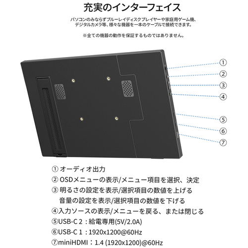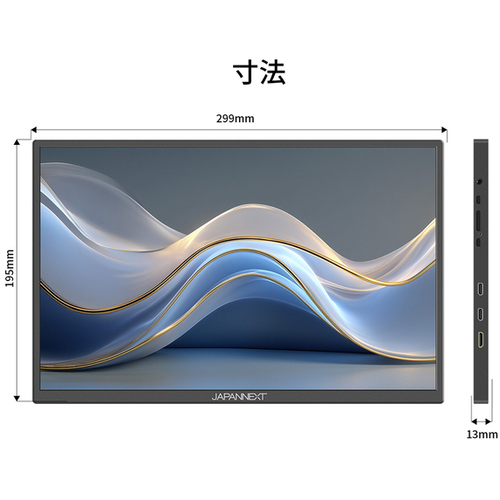●保証期間/2年●サイズ/13.3型●液晶パネル方式/IPS●表示色/1677万色sRGB100%DCI-P374%AdobeRGB74%●ピッチ/約0.149mm●解像度/1920×1200●輝度/350cd/m2●コントラスト比/1000:1●視野角/H:178°V:178°●入力信号/デジタル●入力端子/USB-C×1、miniHDMI×1●ケーブル/USB-Cケーブル(1.0m)、miniHDMItoHDMIケーブル(1.0m)、USB-AtoUSB-Cケーブル(1.0m)●スピーカー/あり「2W×2」●本体サイズ(H×W×D)/高195mm×幅299mm×奥行13mm スタンド幅28mm●本体重量/0.5kg●本体カラー/ブラック●電源/AC100-240V50/60HzToDC5V/2A●最大消費電力/10W【ご注意事項】※こちらの商品は返品不可商品となります。※商品仕様につきましては、メーカーHPにてご確認ください。※仕入先直送品のため、在庫状況により上記お届け目安にてお届けできない場合がございます。※詳細納期をご確認されたい場合は、0120-812-069までご連絡ください。(お問い合わせ受付時間)月曜日~金曜日9時から18時30分(祝日を除く)