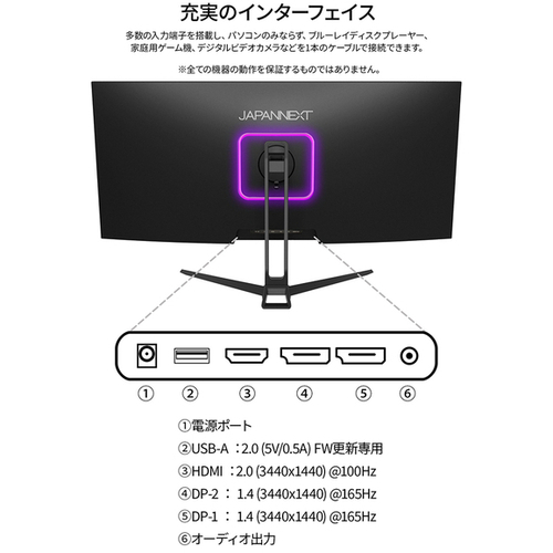 ●保証期間/2年●サイズ/34型●液晶パネル方式/IPS●表示色/1677万色sRGB96%DCI-P376%●ピッチ/約0.2325mm●解像度/3440×1440●輝度/350cd/m2●コントラスト比/1000:1●視野角/H:178° V:178°●入力信号/デジタル●入力端子/HDMI×2、DP×1●ケーブル/電源ケーブル(1.5m)、DPケーブル(1.5m)●スピーカー/あり「3W×2」●本体サイズ(H×W×D)/高445mm×幅816mm×奥行234mm スタンド幅479mm●本体重量/5.2kg●本体カラー/ブラック●電源/AC100-240V50/60HzToDC12V/6A●最大消費電力/62W【ご注意事項】※こちらの商品は返品不可商品となります。※商品仕様につきましては、メーカーHPにてご確認ください。※仕入先直送品のため、在庫状況により上記お届け目安にてお届けできない場合がございます。※詳細納期をご確認されたい場合は、0120-812-069までご連絡ください。(お問い合わせ受付時間)月曜日~金曜日9時から18時30分(祝日を除く)