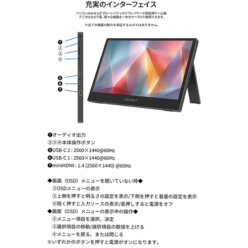 ●保証期間/2年●サイズ/11.6型●液晶パネル方式/VA●表示色/1677万色sRGB100%DCI-P374%AdobeRGB74%●ピッチ/約0.1005mm●解像度/2560×1440●輝度/350cd/m2●コントラスト比/1000:1●視野角/H:160° V:160°●入力信号/デジタル●入力端子/USB-C×2、miniHDMI×1●ケーブル/USB-Cケーブル(1.0m)、miniHDMItoHDMIケーブル(1.0m)、USB-AtoUSB-Cケーブル(1.0m)●スピーカー/あり「1W×2」●本体サイズ(H×W×D)/高177mm×幅277mm×奥行12mm スタンド幅28mm●本体重量/0.45kg●本体カラー/ブラック●電源/AC100-240V50/60HzToDC5V/2A●最大消費電力/8W【ご注意事項】※こちらの商品は返品不可商品となります。※商品仕様につきましては、メーカーHPにてご確認ください。※仕入先直送品のため、在庫状況により上記お届け目安にてお届けできない場合がございます。※詳細納期をご確認されたい場合は、0120-812-069までご連絡ください。(お問い合わせ受付時間)月曜日~金曜日9時から18時30分(祝日を除く)