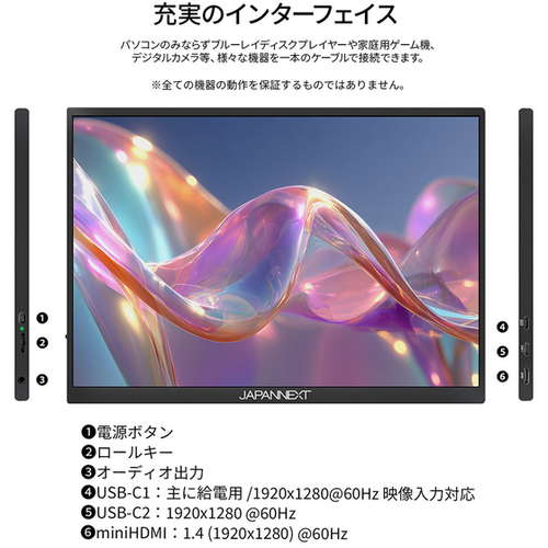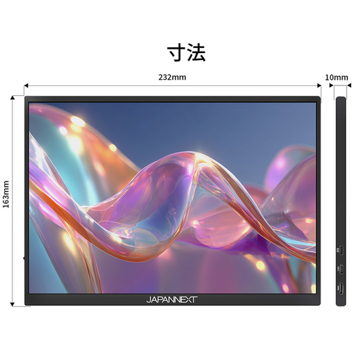 ●保証期間/2年●サイズ/10.5型●液晶パネル方式/IPS●表示色/1677万色sRGB100%DCI-P376%AdobeRGB76%●ピッチ/約0.116mm●応答速度/50ms●走査周波数(垂直)/60●解像度/1920×1280●輝度/420cd/m2●コントラスト比/1500:1●視野角/H:178° V:178°●入力信号/デジタル●入力端子/USB-C×2、miniHDMI×1●ケーブル/USB-Cケーブル(1.0m)、miniHDMItoHDMIケーブル(1.0m)、USB-AtoUSB-Cケーブル(1.2m)●スピーカー/あり「1W×2」●本体サイズ(H×W×D)/高163mm×幅232mm×奥行10mm スタンド幅234mm●本体カラー/ブラック●本体重量/0.28kg●電源/AC100-240V50/60Hz5V/3A●最大消費電力/5W【ご注意事項】※こちらの商品は返品不可商品となります。※商品仕様につきましては、メーカーHPにてご確認ください。※仕入先直送品のため、在庫状況により上記お届け目安にてお届けできない場合がございます。※詳細納期をご確認されたい場合は、0120-812-069までご連絡ください。(お問い合わせ受付時間)月曜日~金曜日9時から18時30分(祝日を除く)