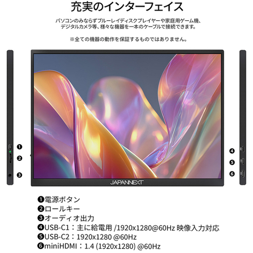 ●保証期間/2年●サイズ/10.5型●液晶パネル方式/IPS●表示色/1677万色sRGB100%DCI-P376%AdobeRGB76%●ピッチ/約0.116mm●応答速度/50ms●走査周波数(垂直)/60●解像度/1920×1280●輝度/420cd/m2●コントラスト比/1500:1●視野角/H:178° V:178°●入力信号/デジタル●入力端子/USB-C×2、miniHDMI×1●ケーブル/USB-Cケーブル(1.0m)、miniHDMItoHDMIケーブル(1.0m)、USB-AtoUSB-Cケーブル(1.2m)●スピーカー/あり「1W×2」●本体サイズ(H×W×D)/高163mm×幅232mm×奥行10mm スタンド幅234mm●本体カラー/ブラック●本体重量/0.28kg●電源/AC100-240V50/60Hz5V/3A●最大消費電力/5W【ご注意事項】※こちらの商品は返品不可商品となります。※商品仕様につきましては、メーカーHPにてご確認ください。※仕入先直送品のため、在庫状況により上記お届け目安にてお届けできない場合がございます。※詳細納期をご確認されたい場合は、0120-812-069までご連絡ください。(お問い合わせ受付時間)月曜日~金曜日9時から18時30分(祝日を除く)