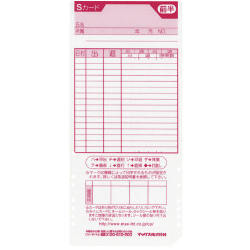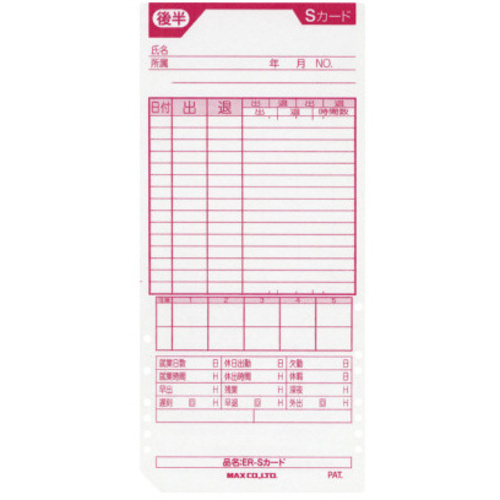 マックスの純正タイムカード。別売りの青色と組み合わせて社員、パート等使い分けが可能です。●対応機種/ER-8S・8S2・10S・20S・25S・80S・80S2シリーズ・110S・110S2・110S3・110S3W・110S4・110S5シリーズ・120S・210S・220S・240S・250S・250S2・270S・300Sシリーズ・200S/PC・230S/PC・201S/PC・231S/PCシリーズ用●仕様/日付印刷なし、表裏自動判別、印字欄自動判別●単位(入数)/1箱(100枚入)【ご注意事項】※1箱単位でお申し込みください。【返品に関するご注意】※開封後はお客様のご都合による返品はお受けできません。【デジタルカタログ】※こちらの商品のデジタルカタログページは、画像下のリンクからご覧いただけます。