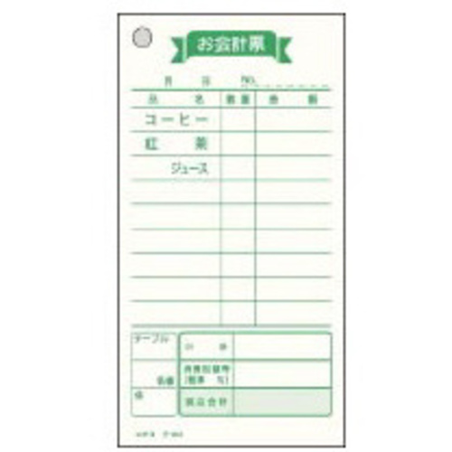 見やすく書きやすい、コクヨのお会計票。●品名/お会計票(品名入り)●タテ×ヨコ/125×66●枚数/100枚●単位/1冊
